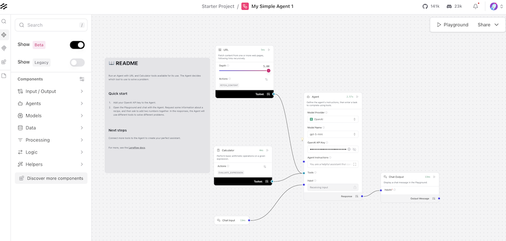 ダウンロードして、すぐに使い始められました。以下は、テンプレートにあったシンプルなAIエージェントのフローです。