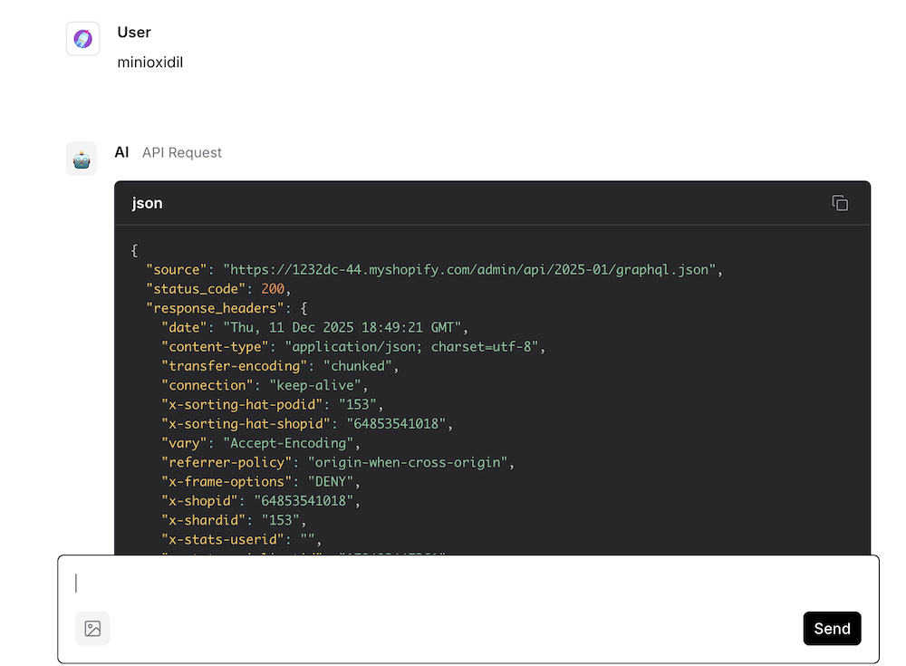 API RequestノードのBodyにqueryとvariablesという2つのキーバリューをセットする。このノードでは、urlとしてShopifyのadmin product api、ヘッダーにアクセストークンをセットしておく。最後にChat Outputへ出力を渡す。